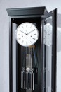 German Grandfather Clock handmade of black-lacquered solid oak. Front and side windows with facet cut. Original Black Forest RS-clockwork and Westminster chime (can be deactivated at night). Polished second compensation pendulum with precision adjustment. Dial enamel with chromed edge.