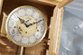 Handmade of solid oak, lateral maple and nut tree inlays. Front and lateral windows with facet cut. Original Black Forest clockwork and Westminster chime (can be deactivated at night). Polished second compensation pendulum with precision adjustment. Dial enamel with chromed edge.