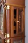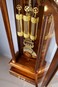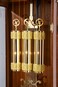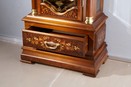 The German Grandfather Clock Lindau is handmade of solid nut tree in combination with root wood veneer and inlays. There is a drawer with a secret compartment inside of the clock. The capitals on the lateral turned columns are made of polished brass, as well as the pendulum and weights. Moreover, the pendulum is equipped with a wooden inlay or engrave with the Neuschwanstein castle and the weights are garnished with ornaments. The front window has a facet cut and golden decor. Original Black Forest clockwork with 3 melodies (can be deactivated at night).